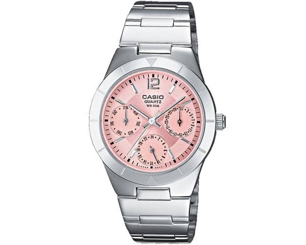 Γυναικείο ρολόι από τον οίκο Casio της σειράς Standard Collection, με ασημένιο μπρασελέ από ανοξείδωτο ατσάλι και καντράν σε ροζ χρώμα.