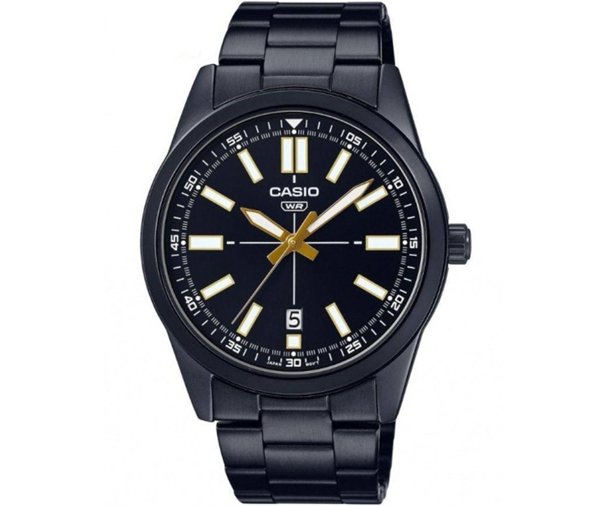 Ανδρικό ρολόι από τον οίκο CASIO της σειράς Analog, με μπρασελέ από μαύρο ανοξείδωτο ατσάλι και μαύρο καντράν με επιχρυσωμένους δείκτες και ενδείξεις.